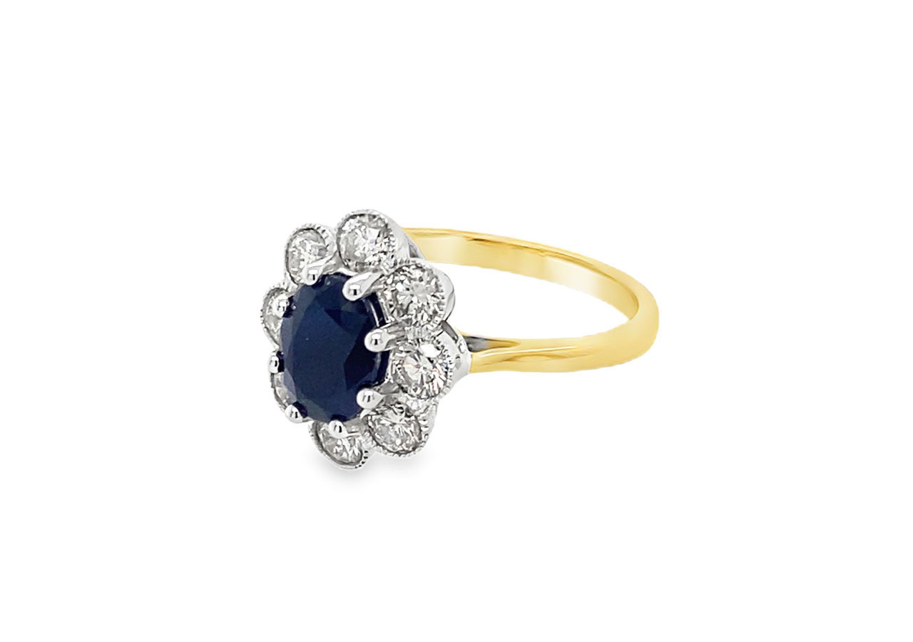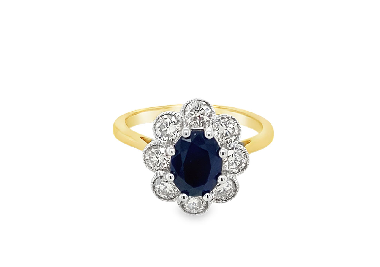 New 9ct yellow gold ring with a large oval sapphire & a diamond halo set in a white gold head.