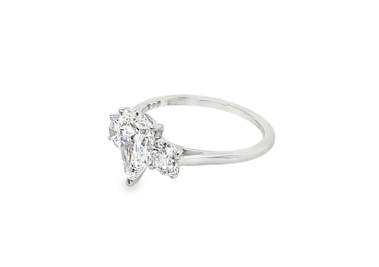 Platinum ring with a central 1.55ct lab grown pear cut diamond accompanied by two 0.35ct round brilliant lab grown diamonds. The central pear cut comes in at a E in colour and VVS2 in clarity.