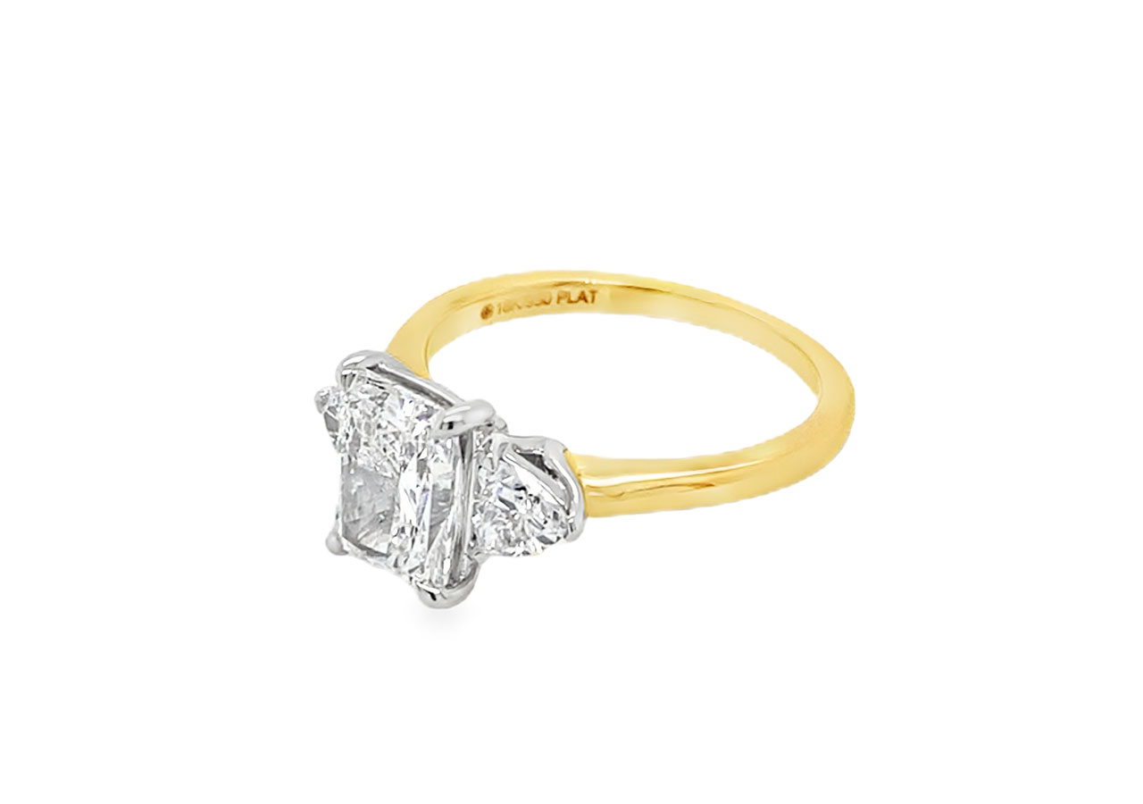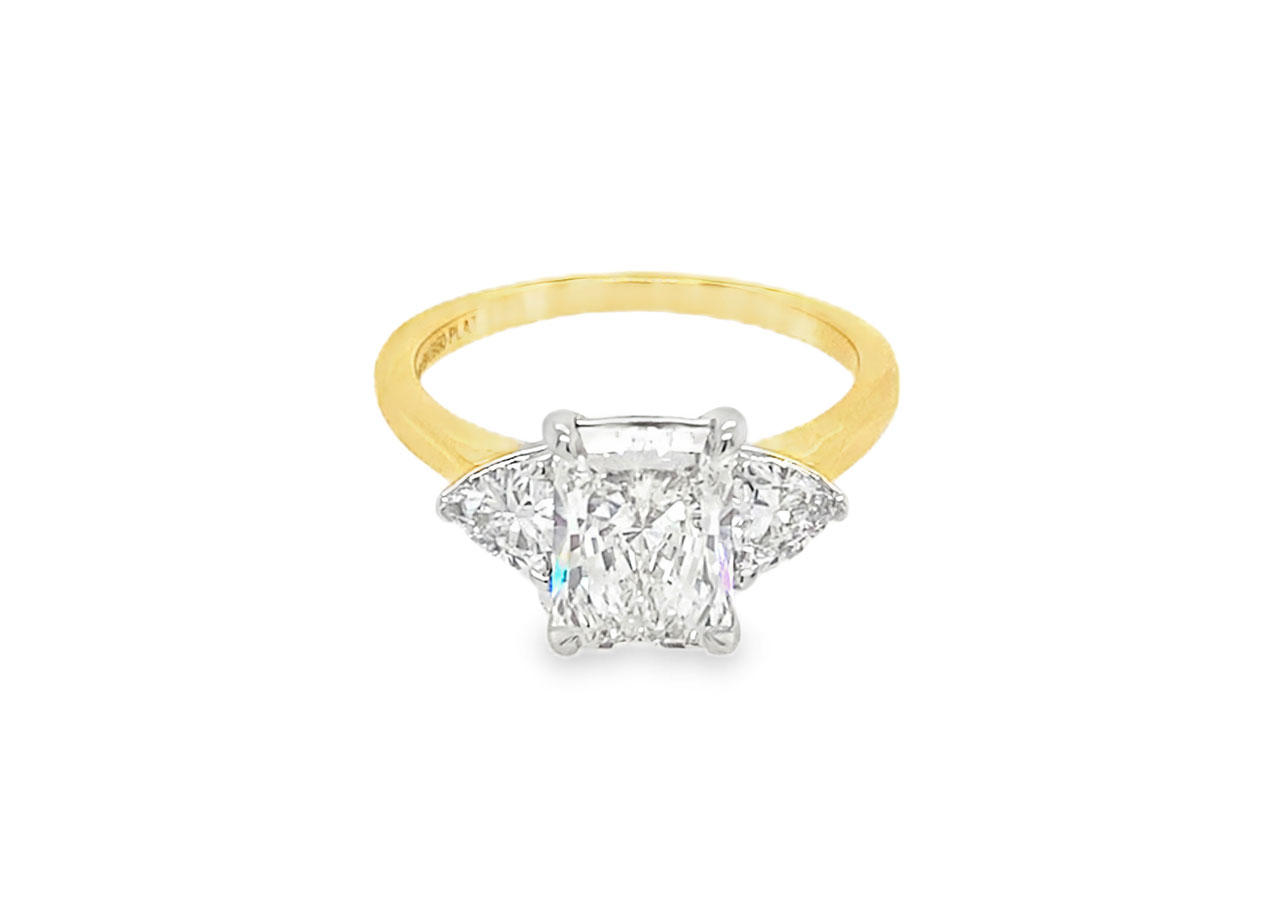 18ct yellow gold band with a platinum head set with a radiant cut lab grown diamond accompanied by a trillion cut either side. The radiant cut has a total carat weight of 2.05ct and has a grading of Colour E and Clarity VS1.