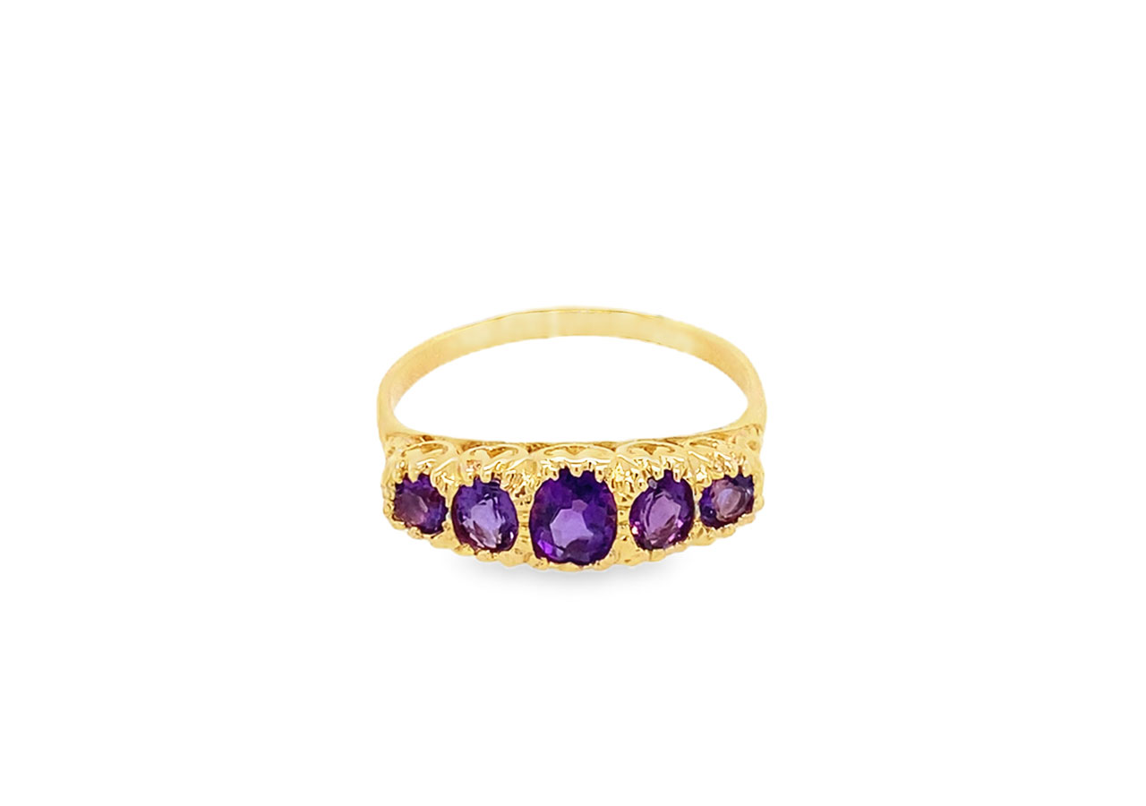9ct yellow gold vintage inspired amethyst 5 stone ring.