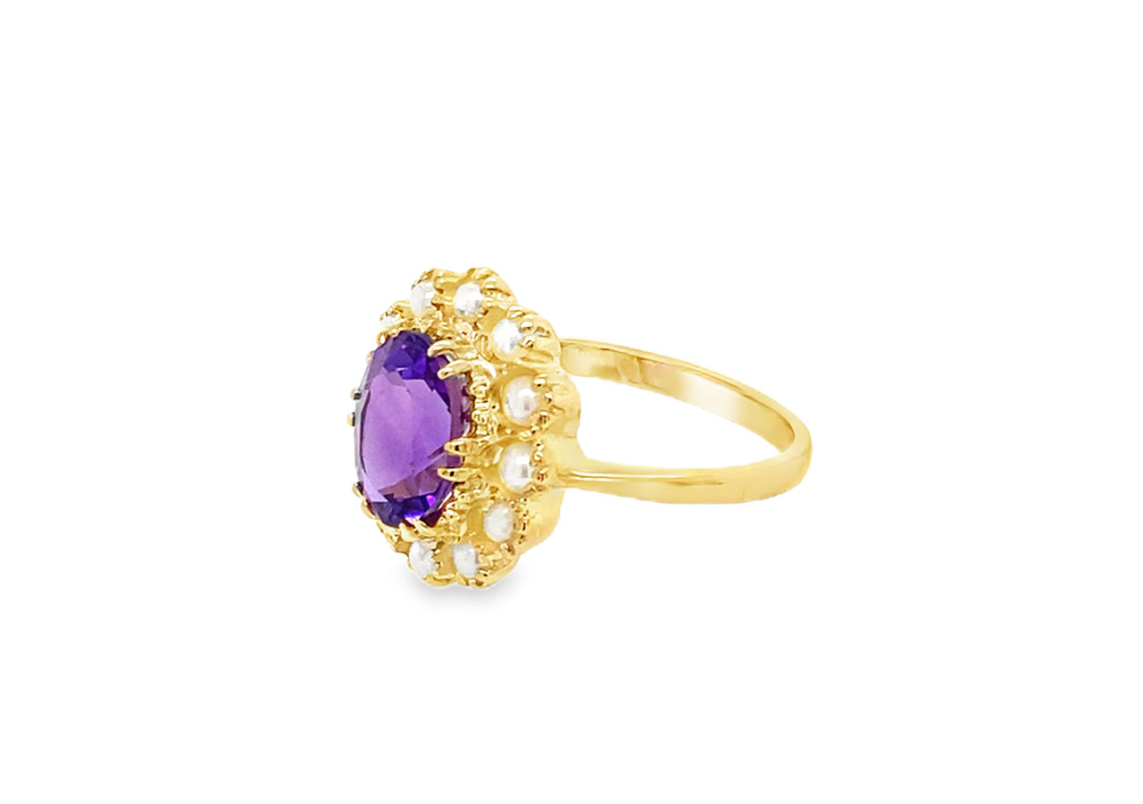 9ct yellow gold vintage inspired ring set with a central amethyst and a surround of seed pearls.