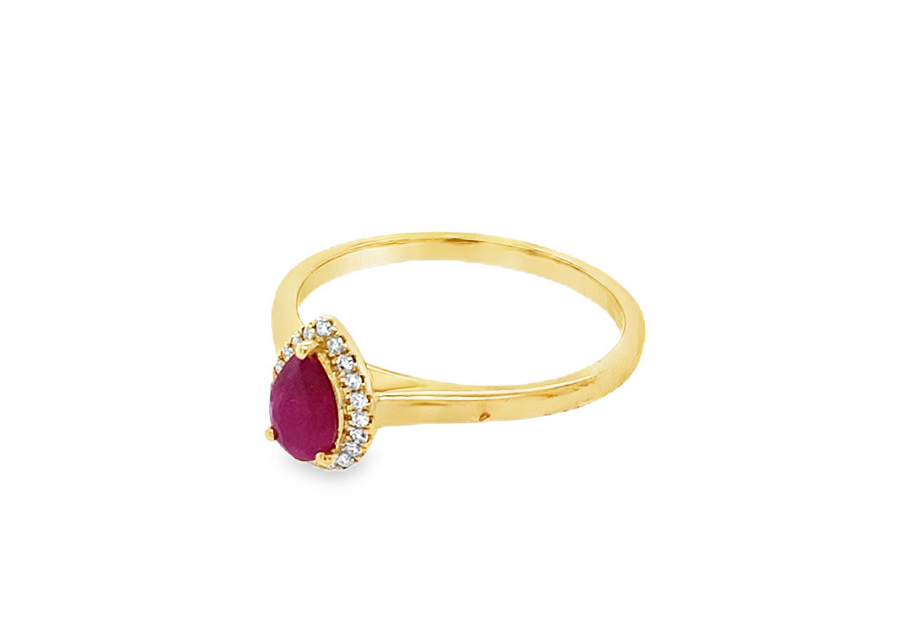 9ct yellow gold ring set with a central pear cut ruby with a halo of diamonds.