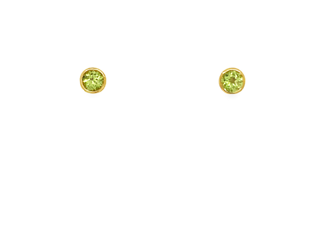 9ct yellow gold peridot studs in a bezel setting.