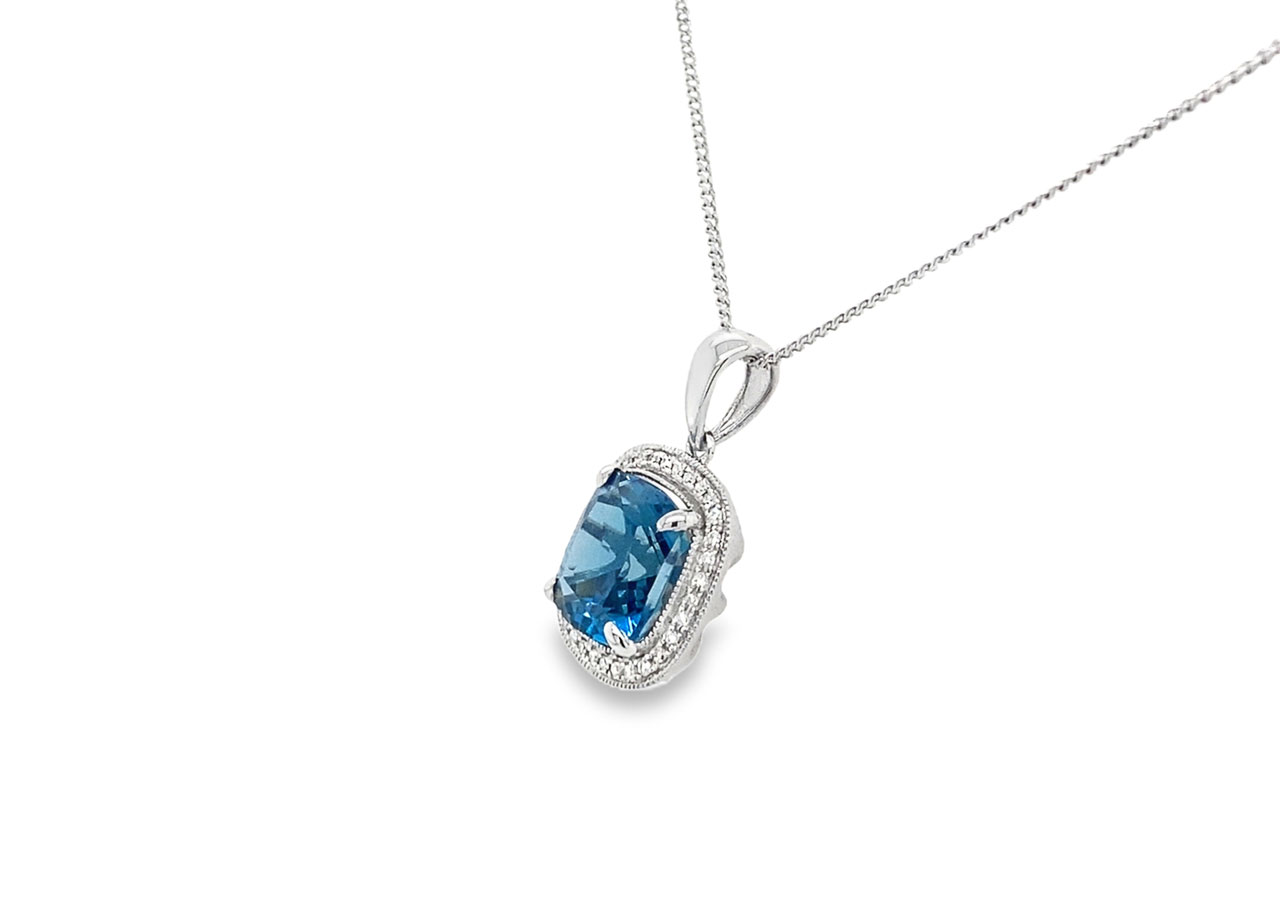 9ct white gold London Blue topaz necklace with a diamond surround on an 18 inch white gold chain.