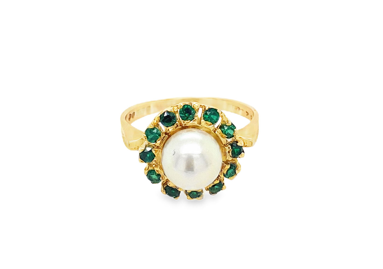 Pre-owned 9ct yellow gold pearl ring set with a surround of green coloured paste stones.