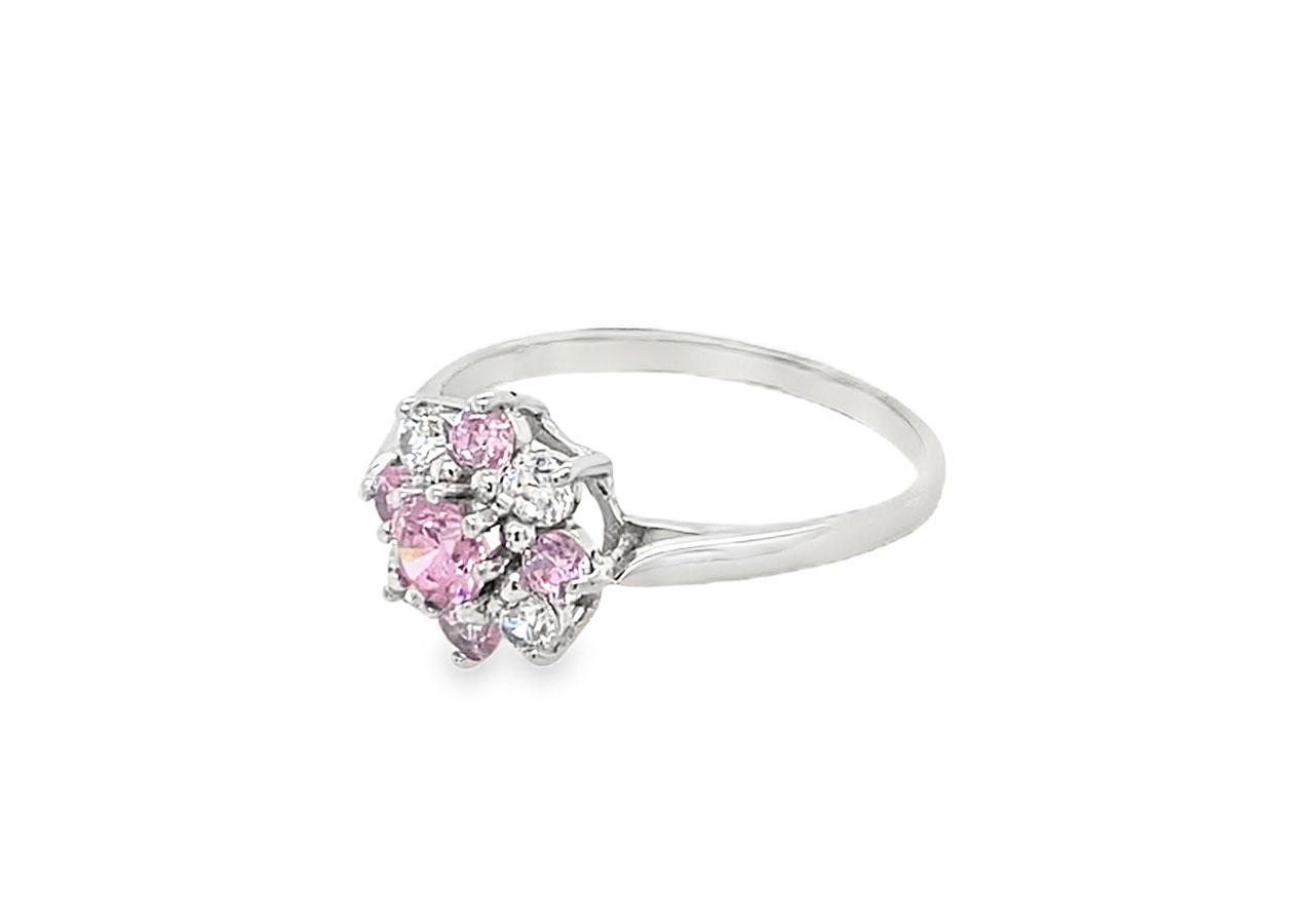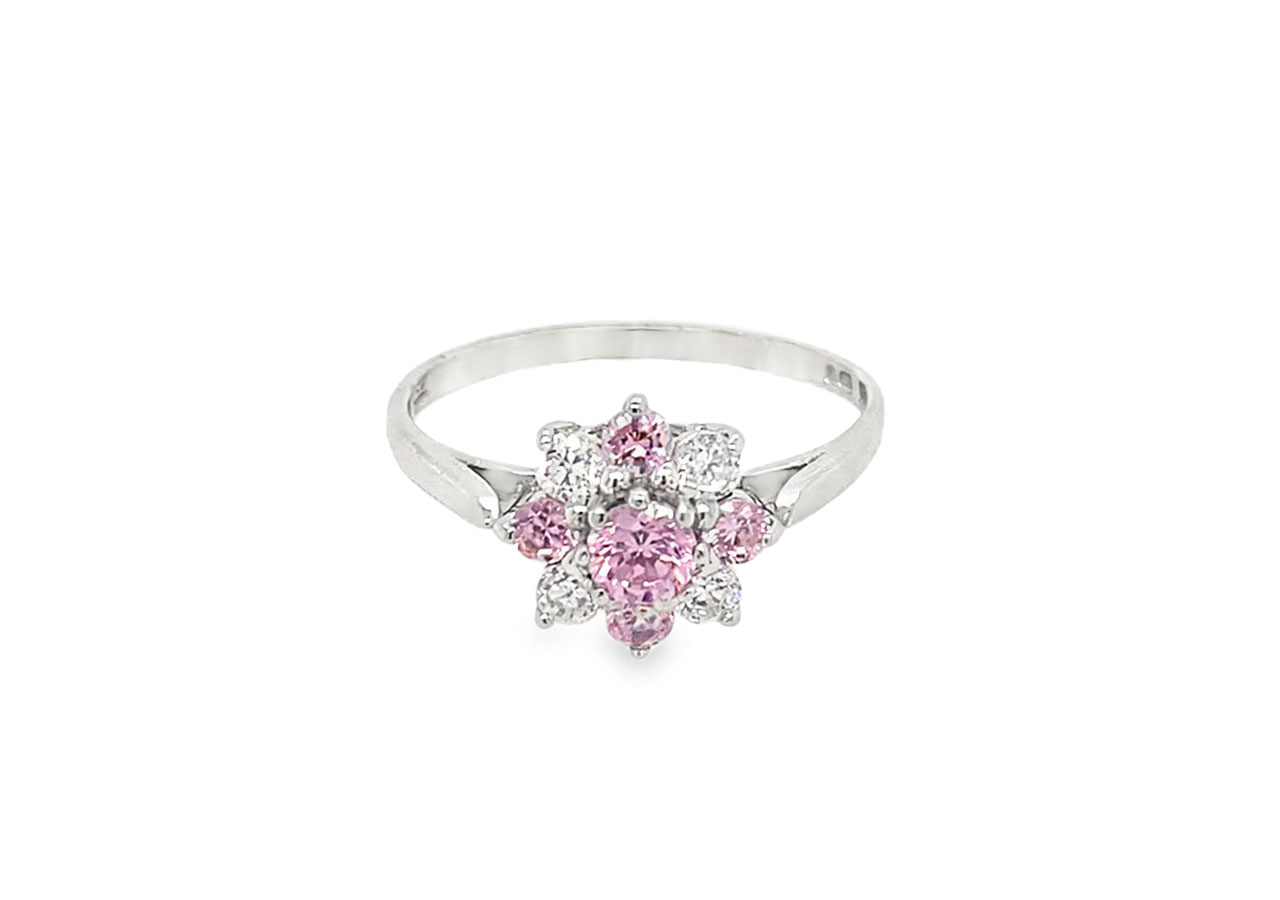 Pre-owned 9ct white gold ring set with a mixture of pink and white cubic zirconia's in a cluster design.