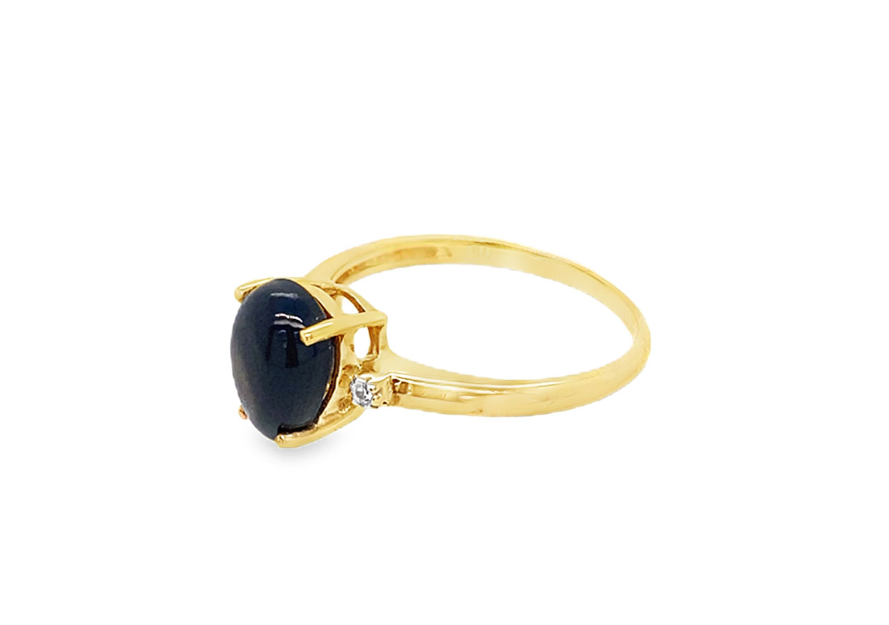 Pre-owned 9ct yellow gold ring with a pear cut cat's eye accompanied by a small white zircon either side.