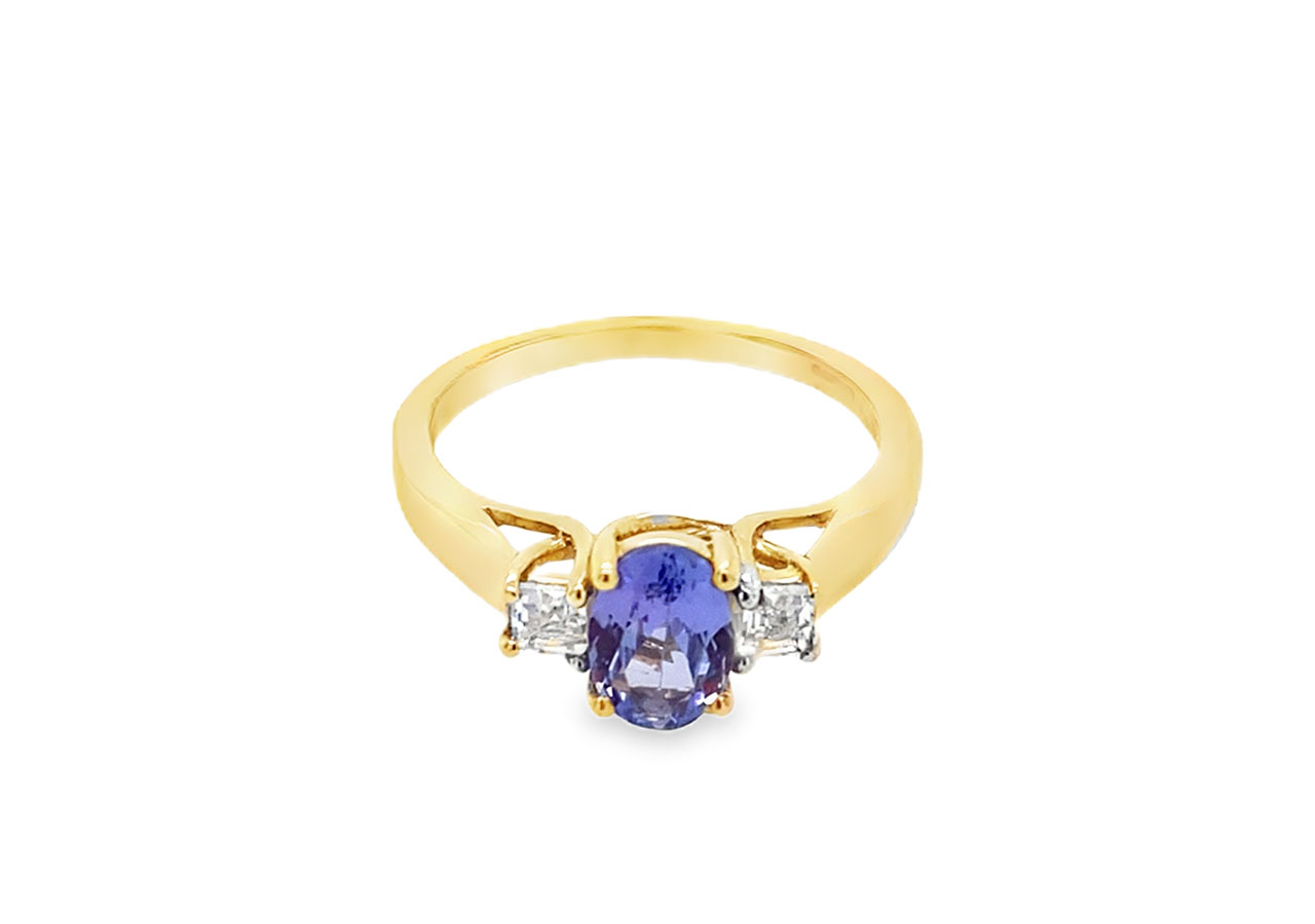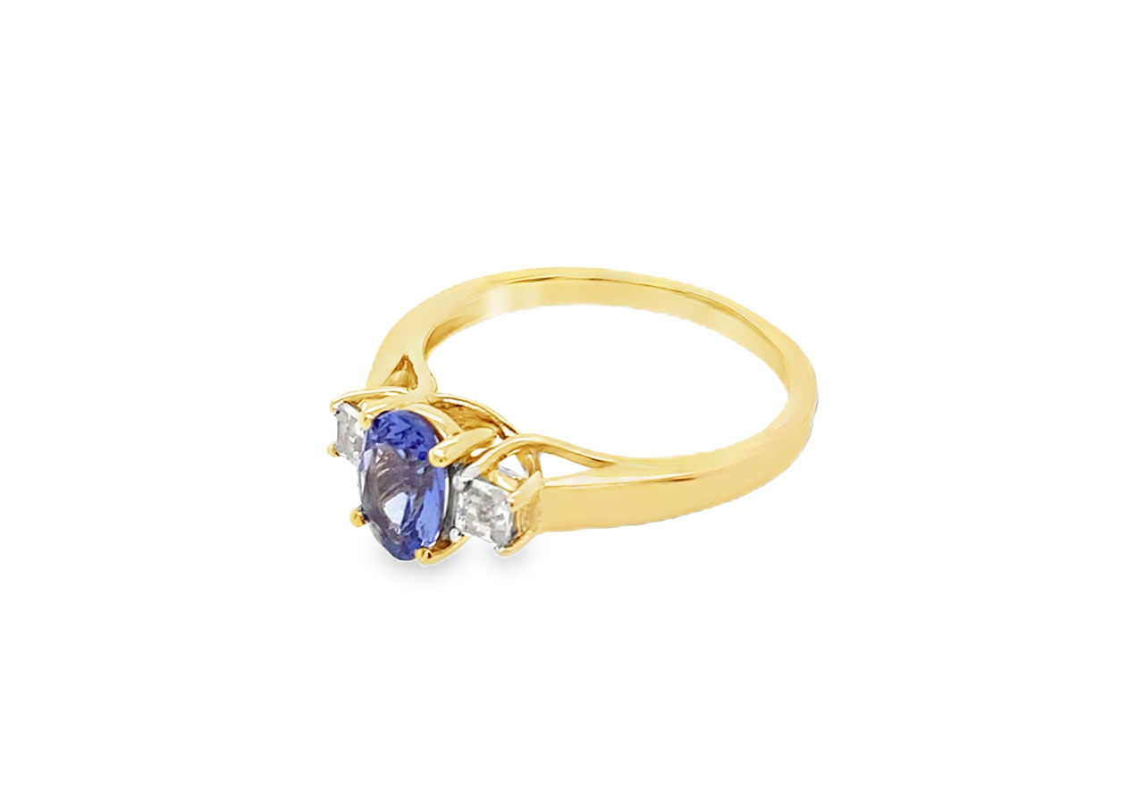 Pre-owned 9ct yellow gold ring with a central oval tanzanite accompanied by 2 white stones.