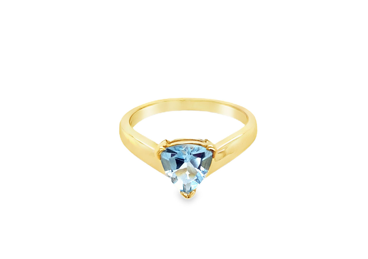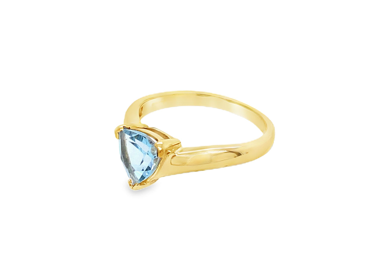 Pre-owned 9ct yellow gold wishbone ring set with a trillion cut blue topaz.