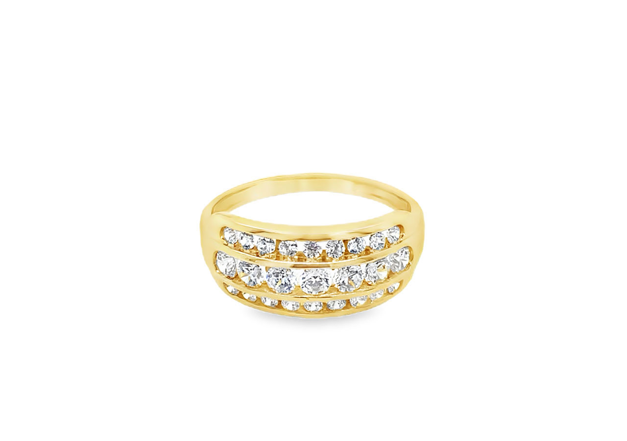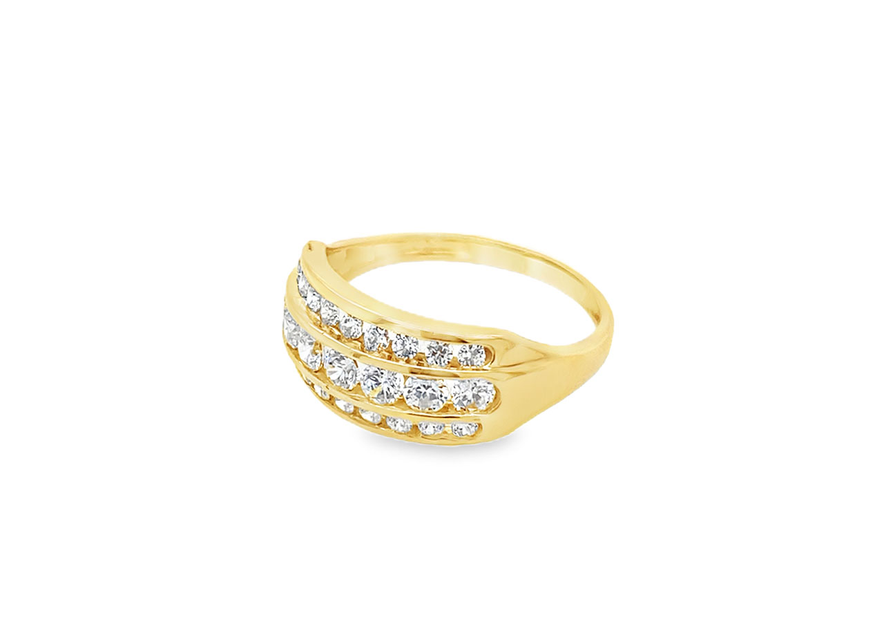 Pre-owned 14ct gold ring featuring three rows of round cut cubic zirconia's in a tension setting.