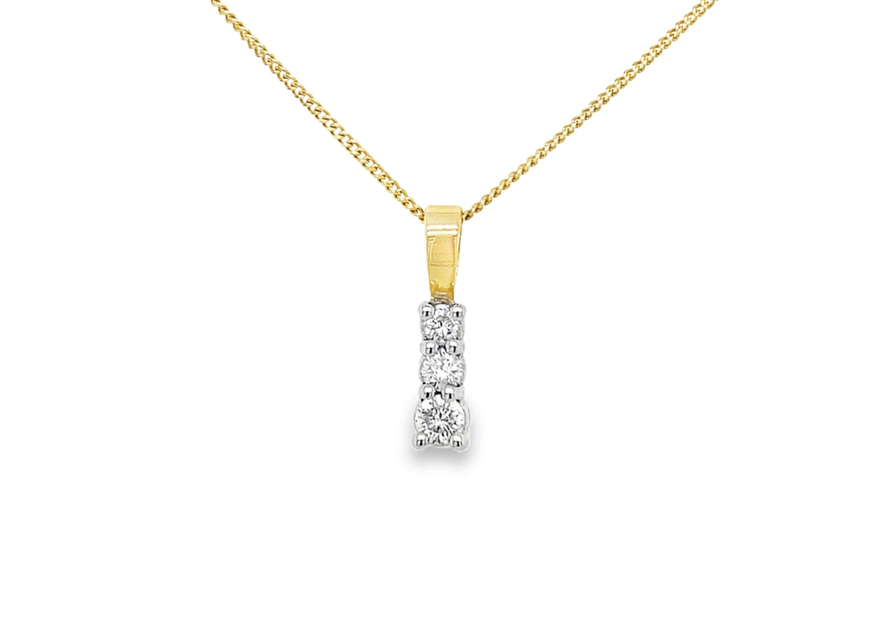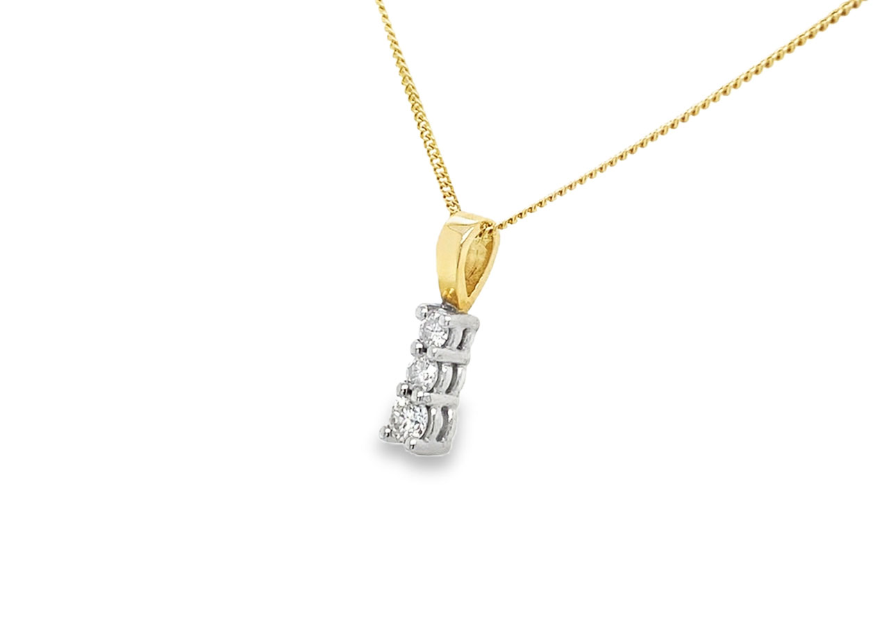 Pre-owned 9ct yellow gold necklace with a pendant holding 3 round brilliant cut natural diamonds. Approximately 0.25ct total carat weight. Chain is 18 inches long.