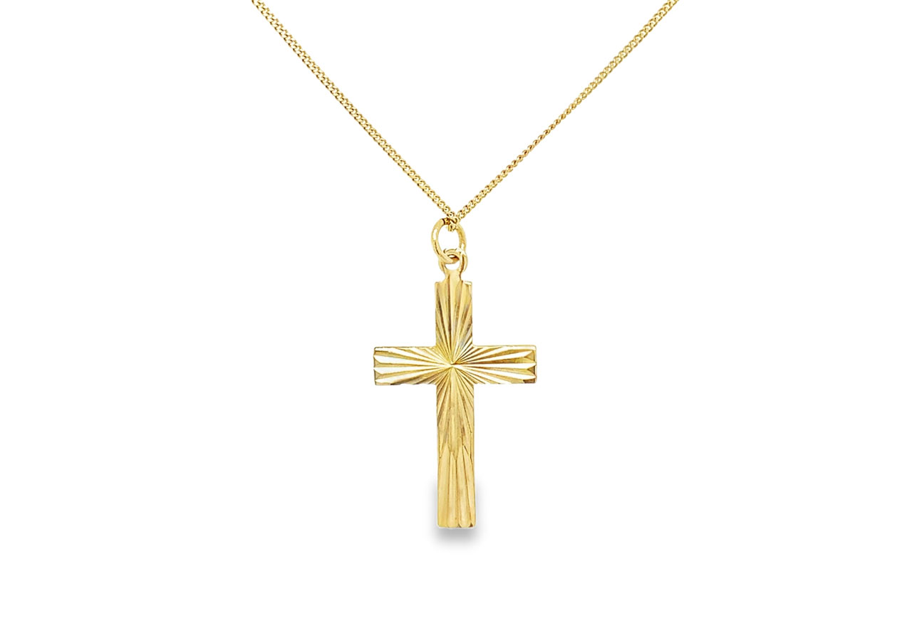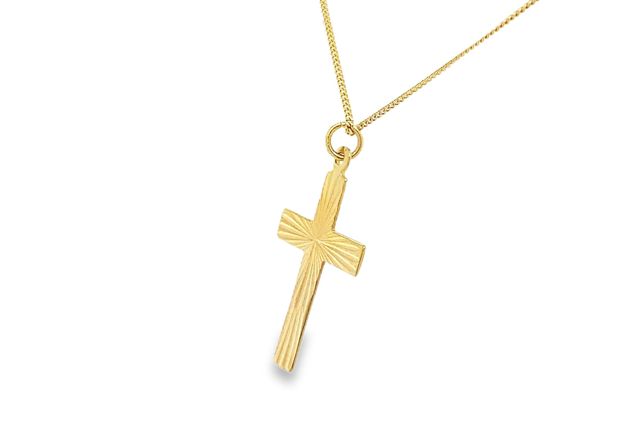 Pre-owned 9ct yellow gold patterned cross with 18 inch chain.