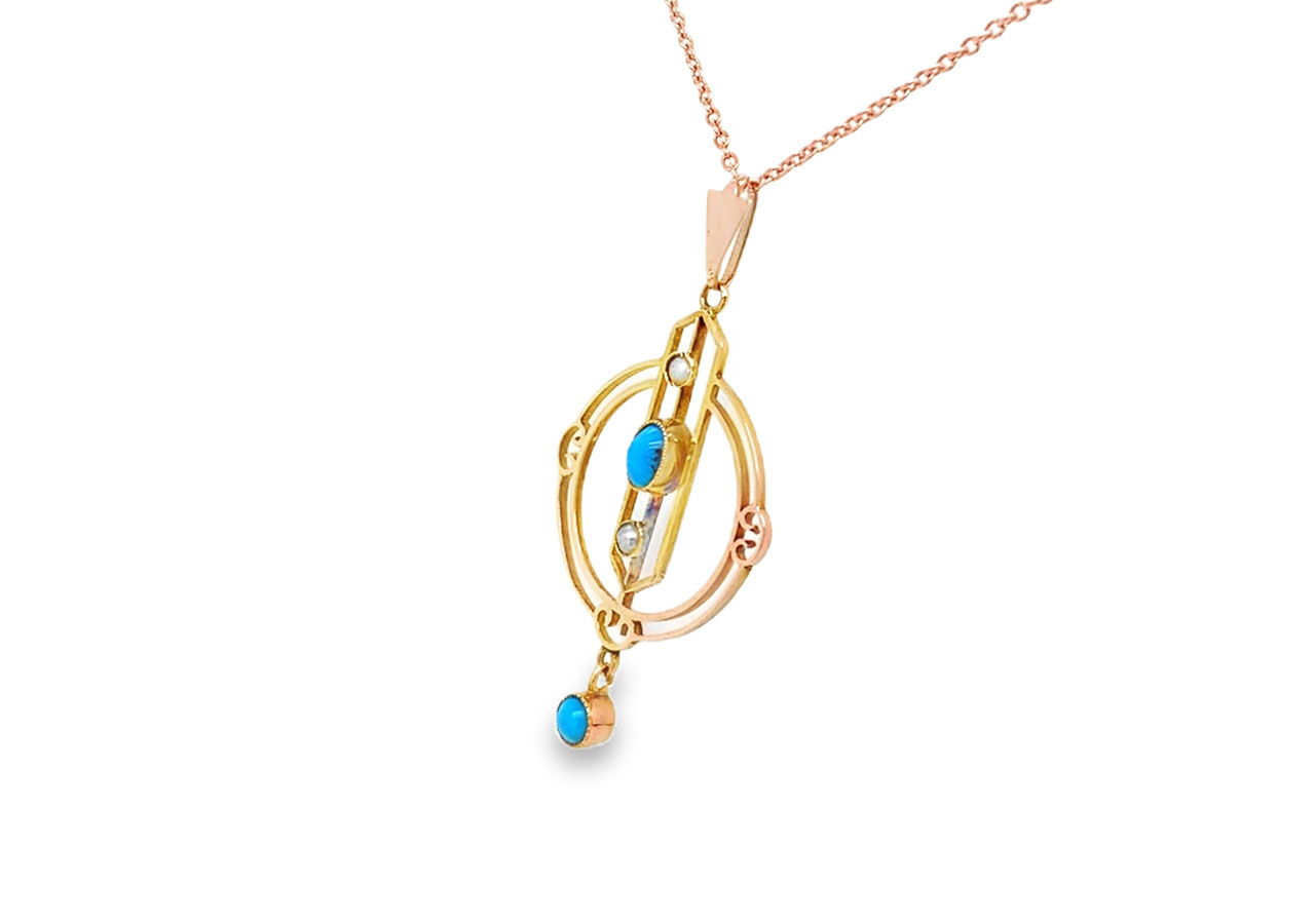 Pre-owned Vintage 9ct Rose Gold Pearl & Turquoise Necklace