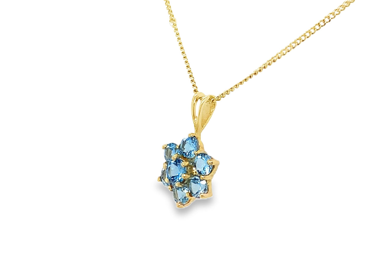 Pre-owned 9ct yellow gold necklace with a flower cluster of blue topaz stones. Chain is 16 inches long.
