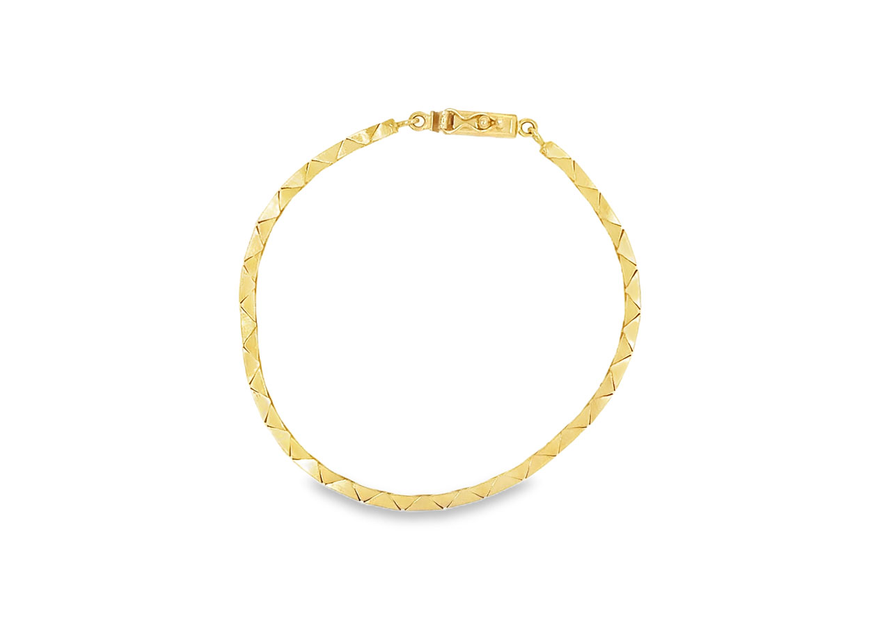 Pre-owned 9ct yellow gold square snake chain bracelet with a textured effect on the flat links. Approximately 6.3 grams.