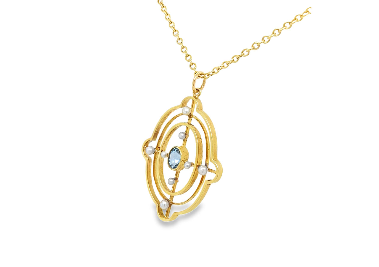 Pre-owned antique 15ct gold pendant featuring a central oval cut aquamarine and surrounded by eight pearls. This pendant is complimented with an 18ct gold 18" trace chain.