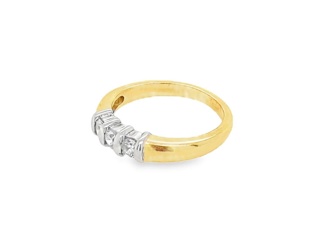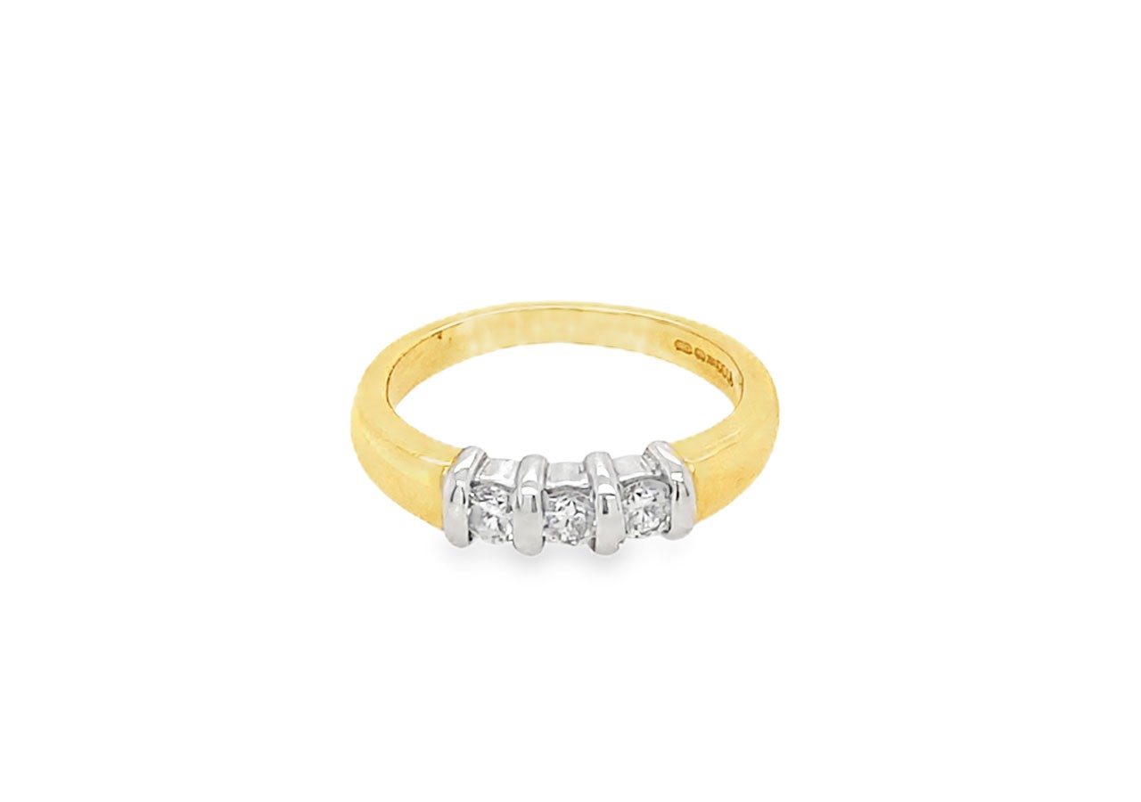 Pre-owned 18ct gold ring set with three round cut diamonds in a tension setting.