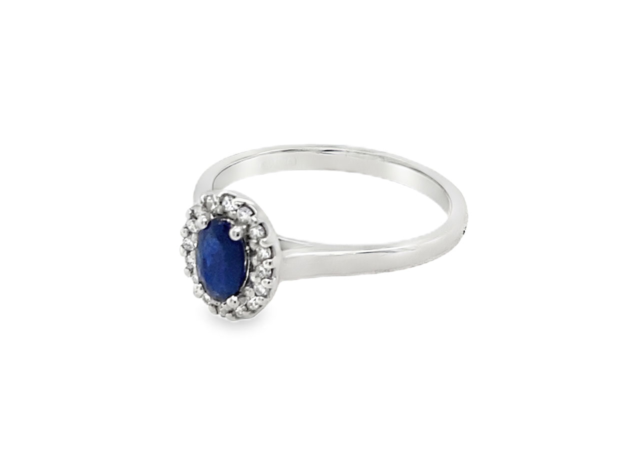 New platinum ring set with a central oval blue sapphire & a surround of round brilliant diamonds in a claw setting.