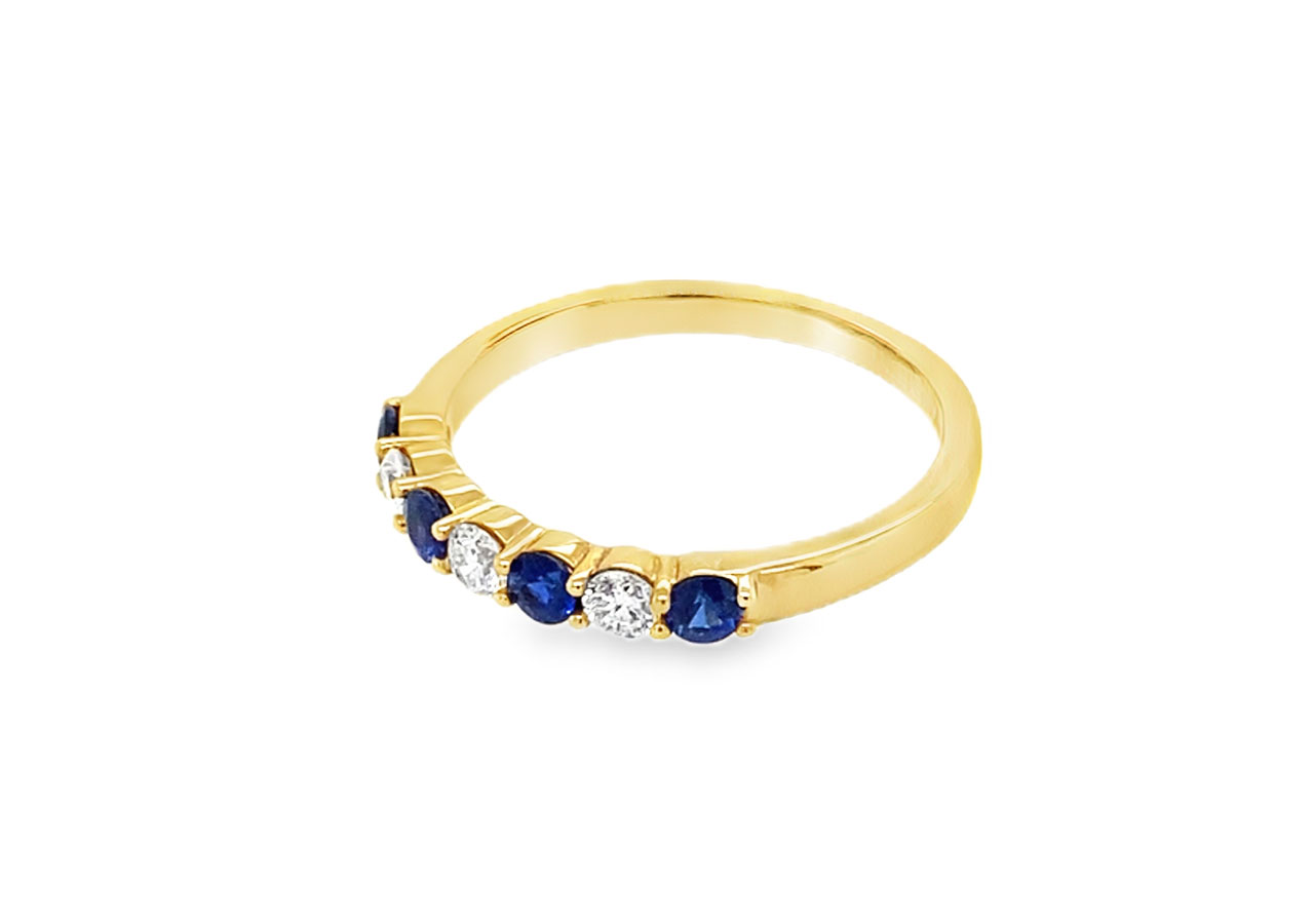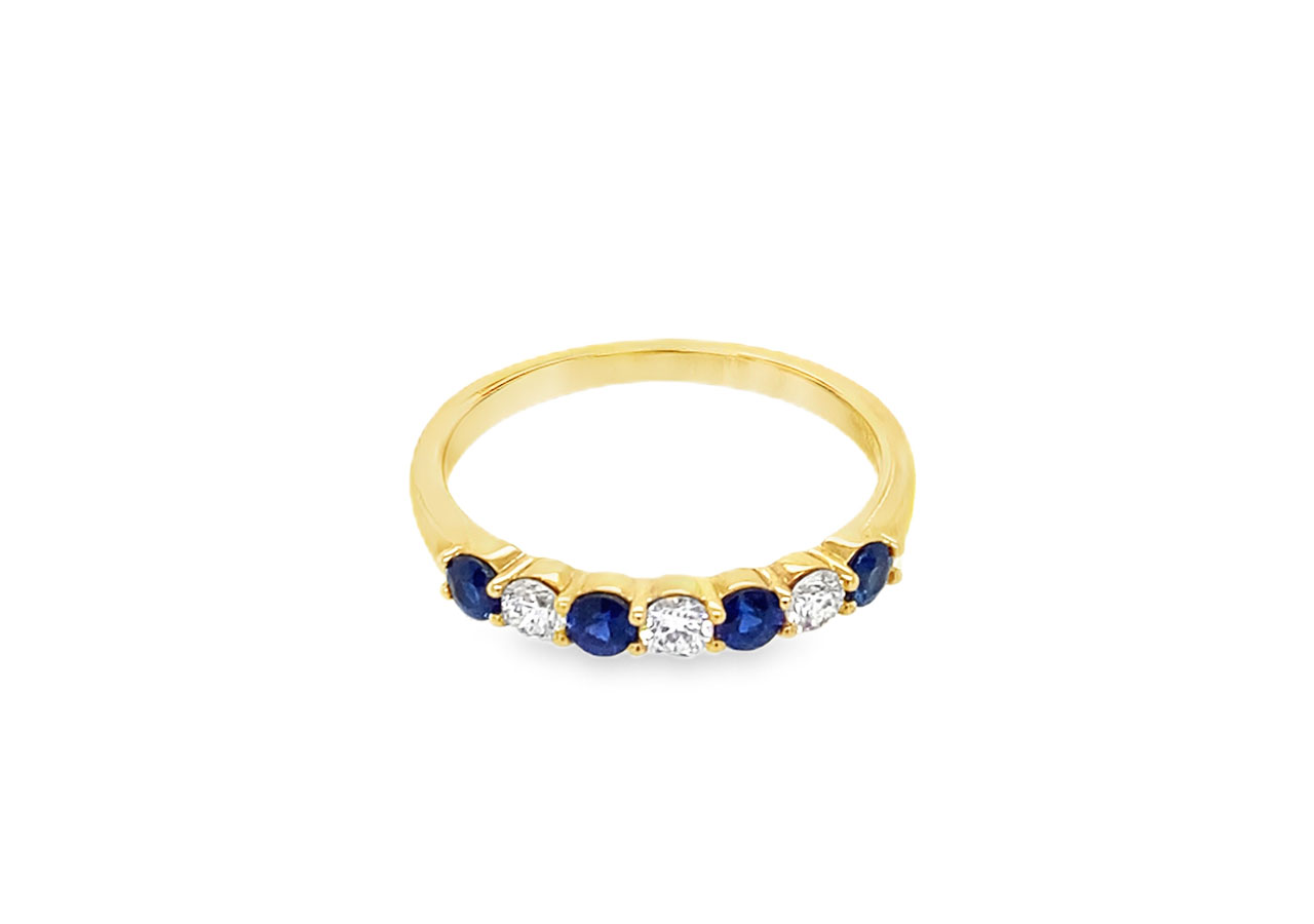9ct yellow gold ring with claw set round brilliant blue sapphires & diamonds.