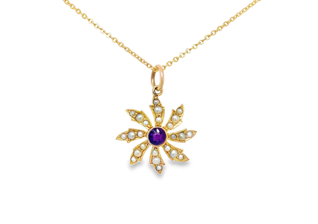 Pre-owned Vintage 9ct Gold Seed Pearl and Amethyst Necklace. Chain is 20 inches long.