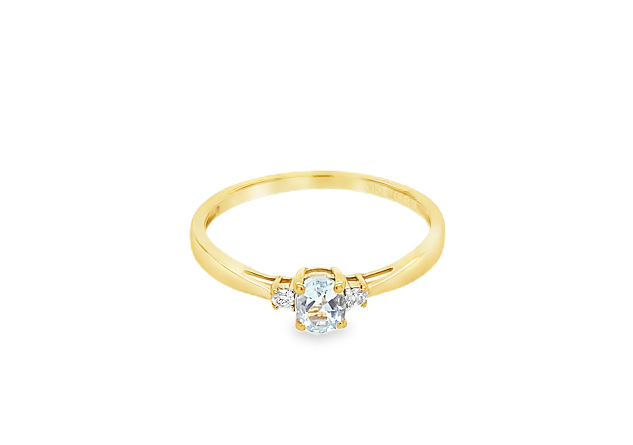 Pre-owned 9ct yellow gold trilogy ring set with a central aquamarine accompanied by two small diamonds.